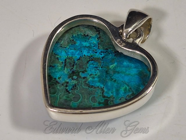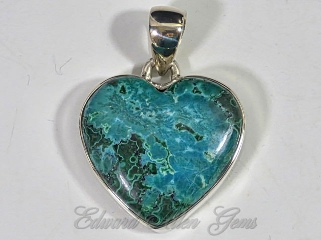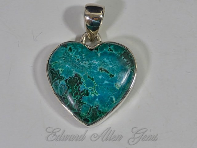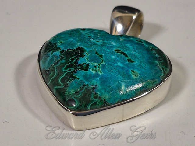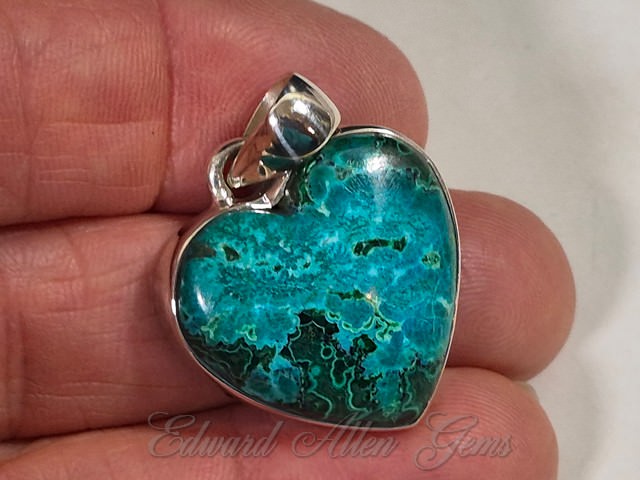 This is a beautiful heart-shaped pendant of Chrysocolla with Malachite. the material comes from the African Congo, and was handcrafted in India. Set in 92.5 Sterling Silver, it measures 30 mm from the top of the bail to the bottom point, and 24 mm side to side (a little over 1" x 1"). The thickness overall is 6 mm, with the setting itself being about 4 mm. If you need a chain for it see the link on the previous page of available items.